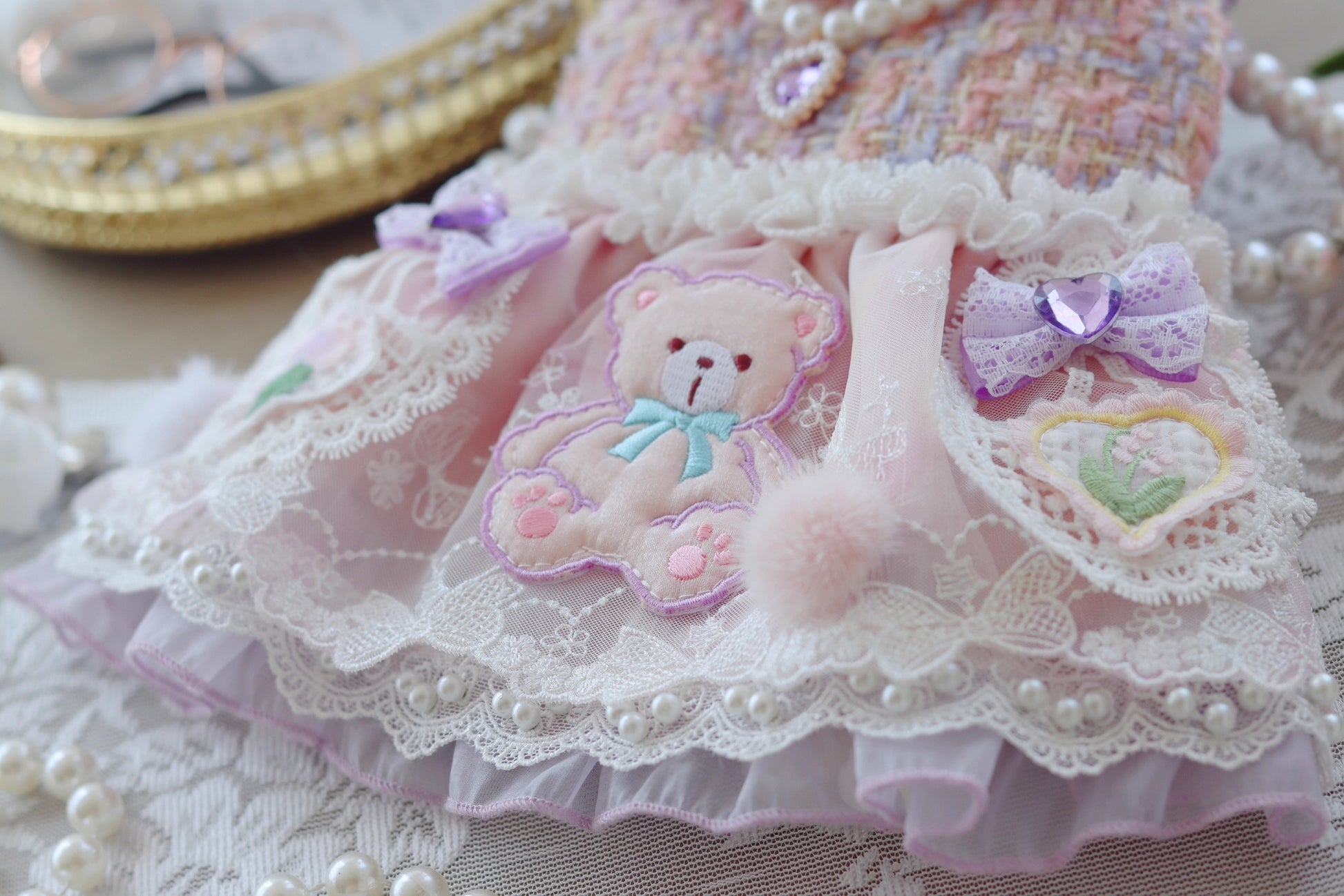 Handmade Teddy Puppy Dress Pink Lace Tweed Skirt