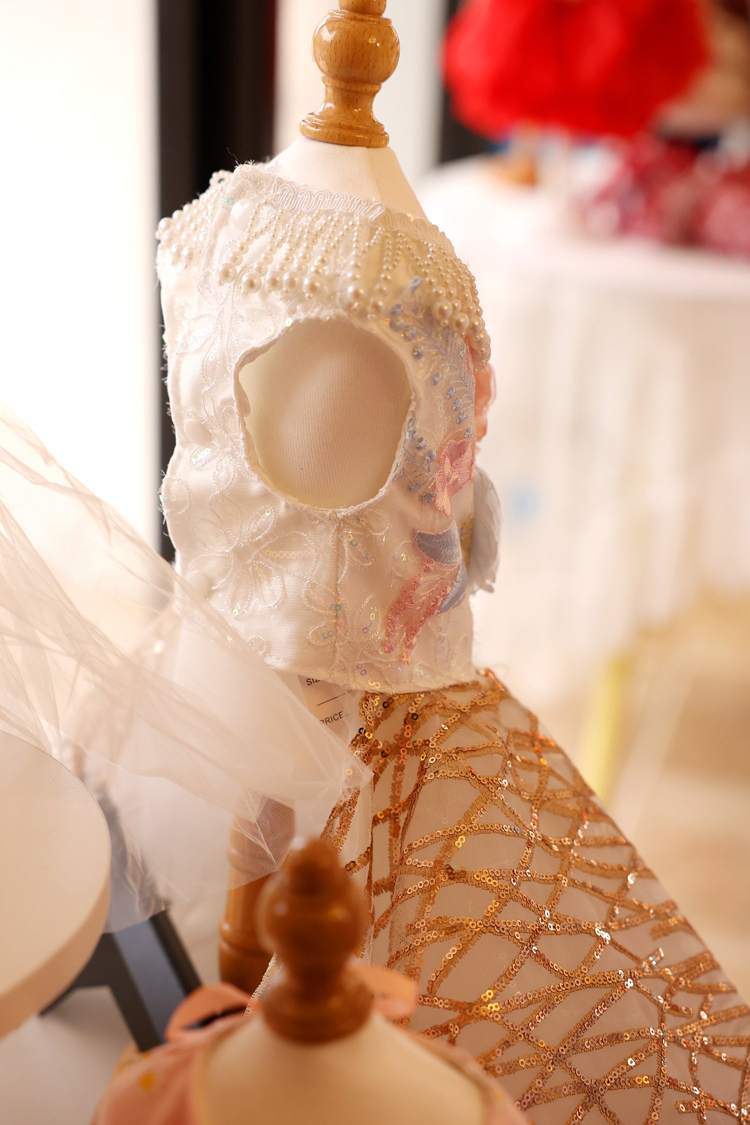 This luxurious princess gown is designed for your beloved fur baby to shine on special occasions. Handcrafted with intricate gold and silver sequin patterns, this stunning dress features delicate floral accents and a soft, flowing skirt that makes your pet the star of any event. Whether it's a wedding, birthday celebration, or photoshoot, this dress exudes elegance and sophistication, making your pet feel like royalty. The dress is comfortable, lightweight, and easy to wear, ensuring your pet stays stylish and at ease.